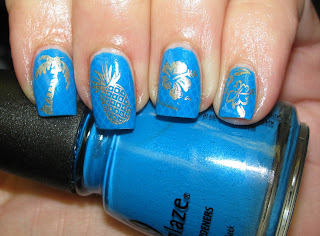 This is my nail of the day. For the base I used two coats of China Glaze - Sky High-Top. Then I stamped the fishnet pattern using Konad plate #M57 and used Sally Hansen - Brisk Blue for the stamp polish. Last I used China Glaze - Passion and Konad plate #M29 to stamp the images. I really like the look of the two blues together, they make such a nice pattern that stands out yet isn't so bold you can't stamp another image over the top.